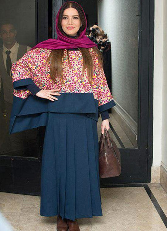 ترکیب رنگهای سورمهای و سفید یکی از شیکترین انتخابهای ستوده است. حضور وی در مراسم اکران فیلم “مسخره باز” نمونهای عالی از هماهنگی جزئیات رنگها و انتخابهایی با دید حرفهای است.